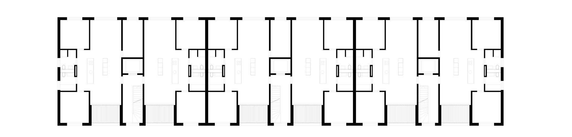 In den Standardgeschossen befinden 3.5 und 4.5-Zimmer-Wohnungen, die sich nur durch die Zuschaltung eines weiteren Zimmers in der Achse der Treppenkerne voneinander unterscheiden. Wohn- und Schlafbereich sind sinnvoll zoniert, die Wohn- und Esszone mit einer zentral liegenden Küche ist durchgesteckt (ost-west orientiert), mit einer jeweils an der Westseite vorgelagerten