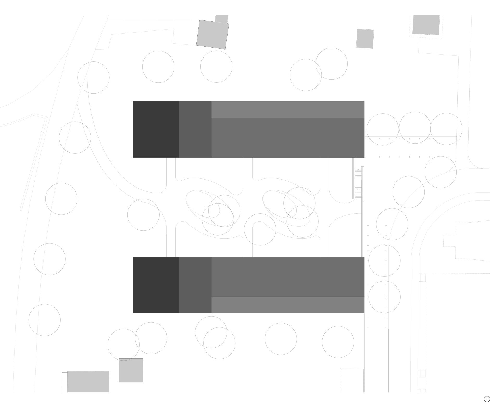 Die Parkierung erfolgt in einer zwischen den Häuserzeilen liegenden Einstellhalle mit 55 Stellplätzen, die sich dem Hanggefälle anpasst und somit einen barrierefreien Zugang zu allen Treppenhäusern ermöglicht. Die Hauseingänge zu den Wohnhäusern sind von einem zentralen Wohnhof zu erreichen, auf dem elipsenförmige Spiel- und Aufenthaltsbereiche angeordnet sind.
