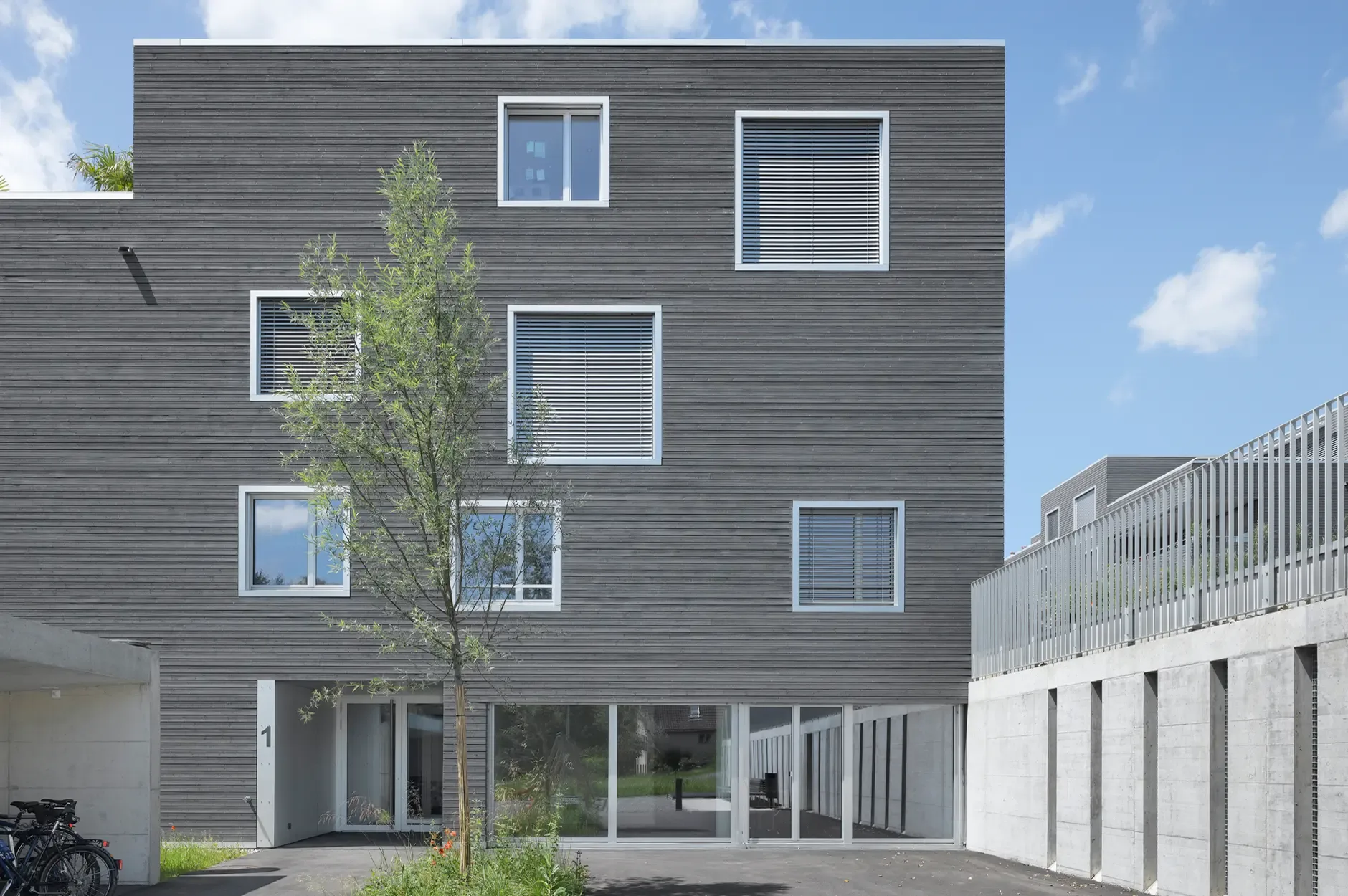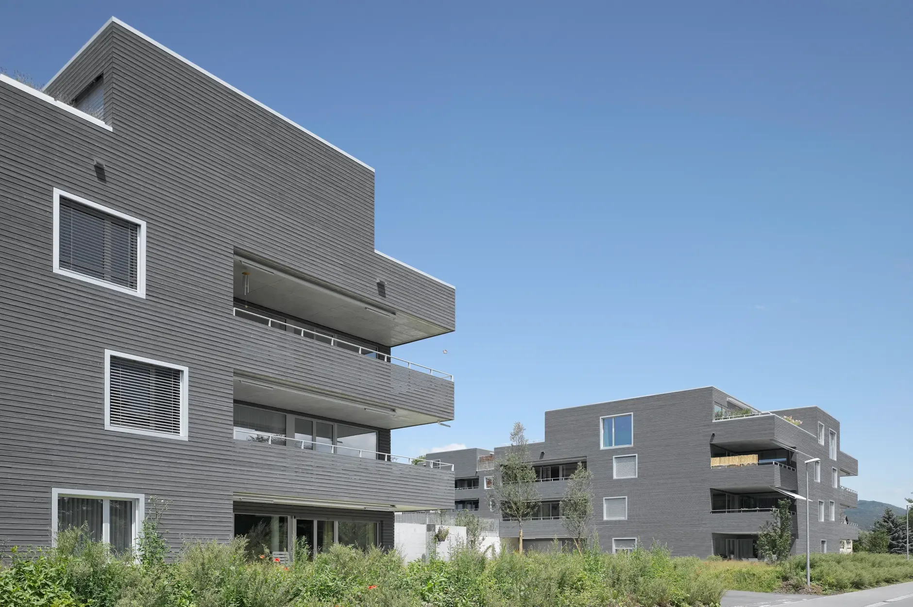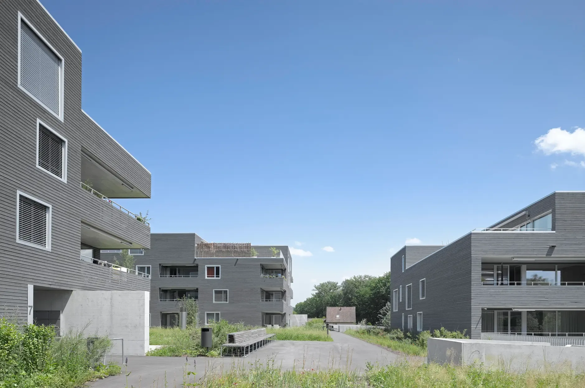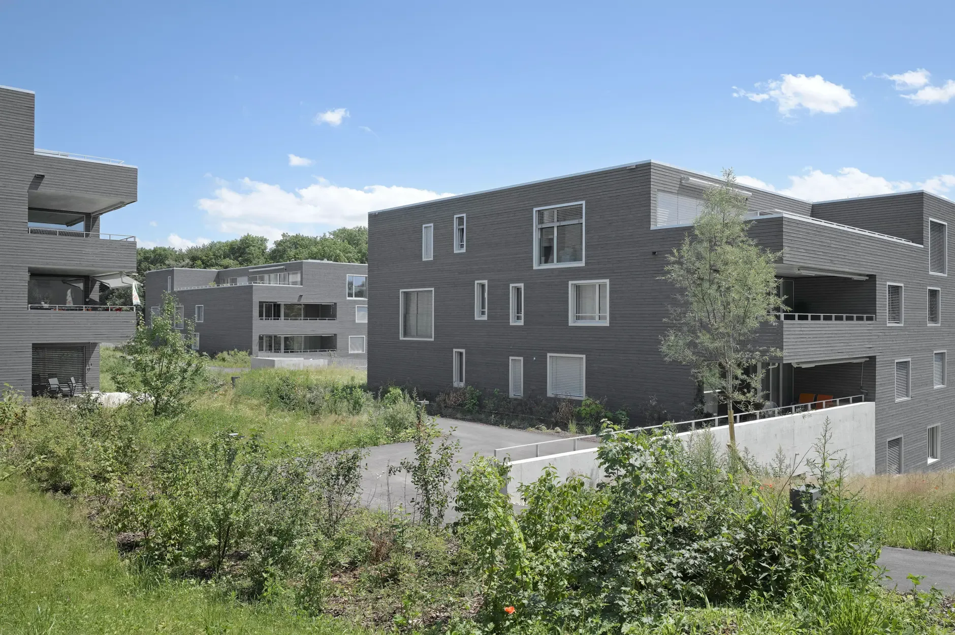 Das Grundstück liegt in Rombach direkt an der Grenze zu Aarau an einer Hanglage, welche gegen Süden, mit Aussicht in die Alpen, ausgerichtet ist. Die Bebauung beinhaltet fünf Punkthäuser. Um maximale Aussicht und Besonnung für jede Wohnung zu gewährleisten, sind vier der fünf Gebäude versetzt um die Parkierung angeordnet. Um eine grosse Wohnungsvielfalt mit unterschiedlichen Wohnungsgrössen anbieten zu können, gibt es verschiedene Haustypen. Diese variieren vom 2-Spänner, 3-Spänner bis zum 4-Spänner. Grundelemente wie Treppen, Nasszellen und Küchen sind jedoch in jedem Gebäude gleich. Damit die Überbauung trotz der unterschiedlich grossen Häuser als Ganzes gelesen wird, sind die Fassaden einheitlich gestaltet. Die kubischen Volumen mit ihrer Tragstruktur aus Beton und Backstein sind mit einer dunklen Holzschalung verkleidet. Die versetzten Attikageschosse, die unterschiedlich grossen Fenster und die Öffnungen der Loggien geben der einfachen, kubischen Architektur eine spielerische Note.