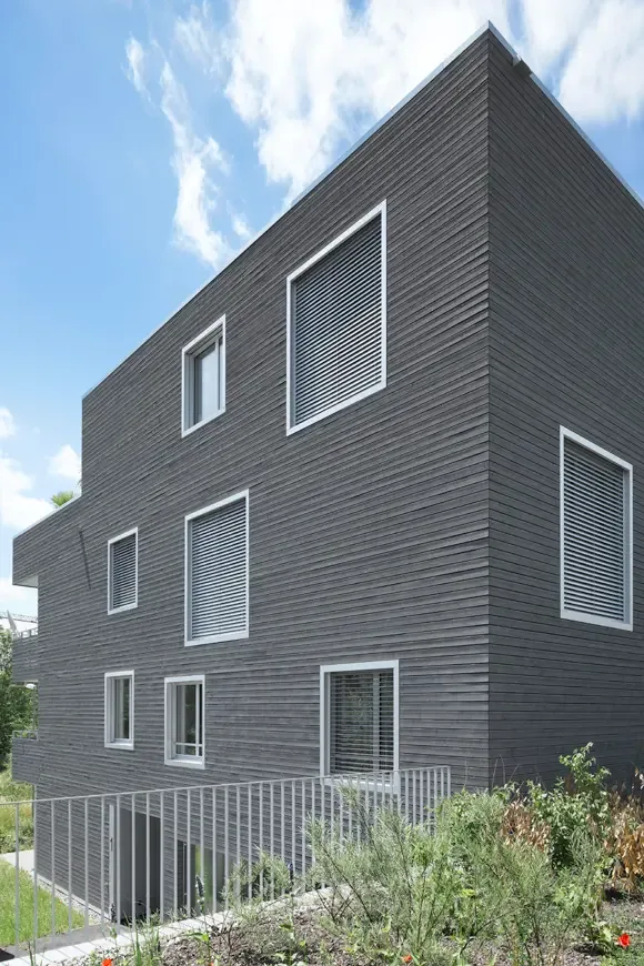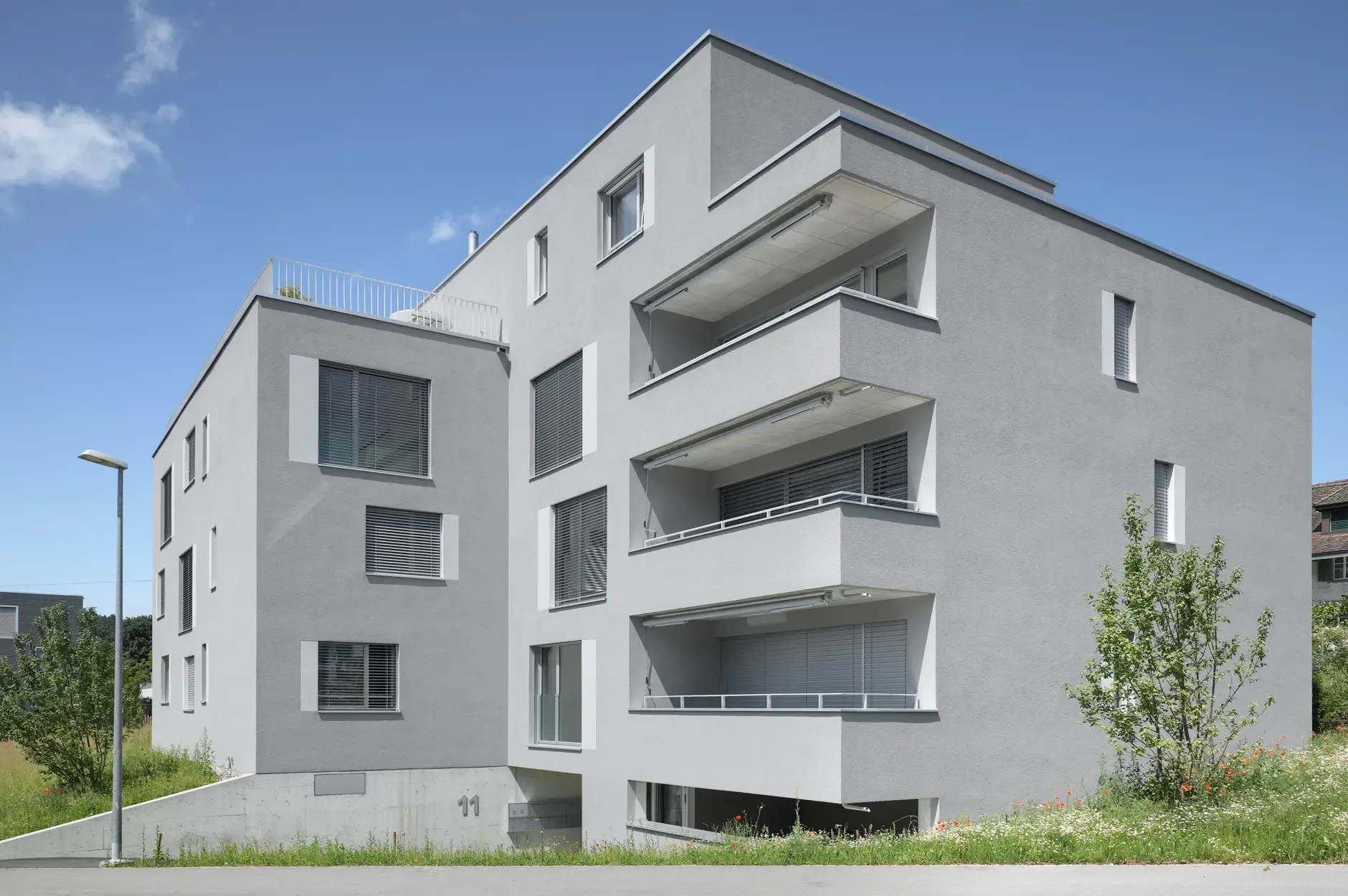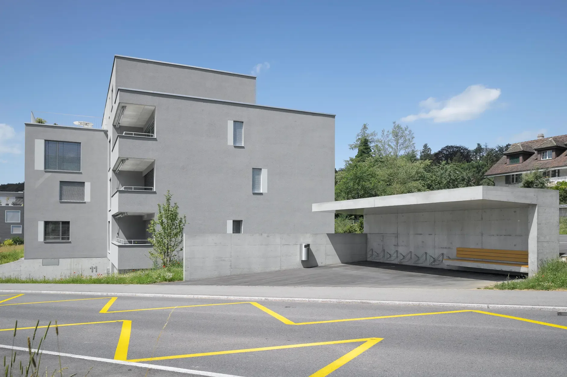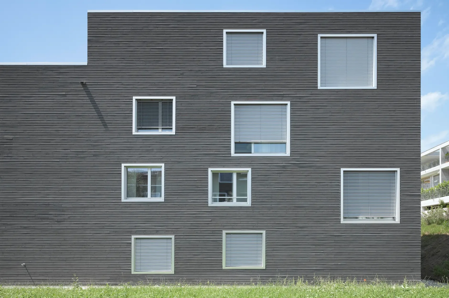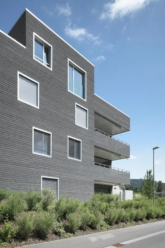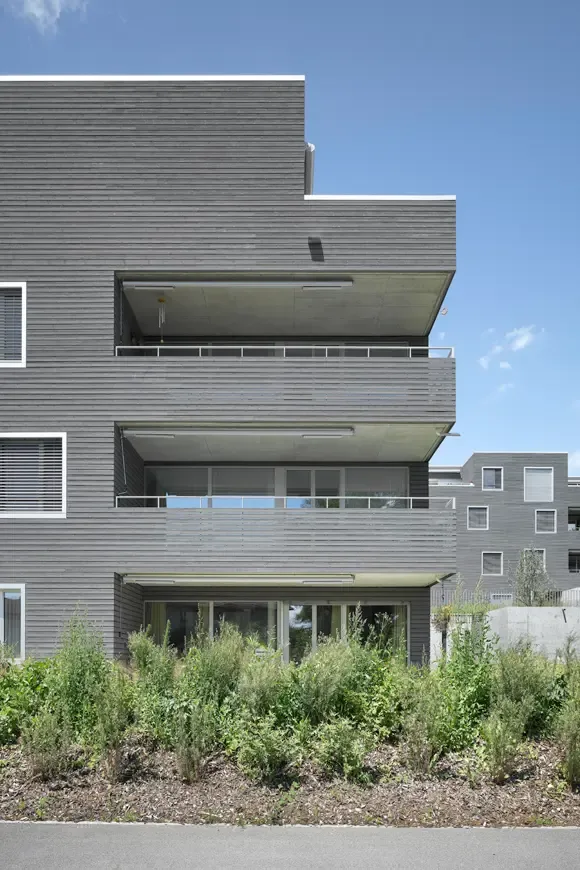 Das Grundstück liegt in Rombach direkt an der Grenze zu Aarau an einer Hanglage, welche gegen Süden, mit Aussicht in die Alpen, ausgerichtet ist. Die Bebauung beinhaltet fünf Punkthäuser. Um maximale Aussicht und Besonnung für jede Wohnung zu gewährleisten, sind vier der fünf Gebäude versetzt um die Parkierung angeordnet. Um eine grosse Wohnungsvielfalt mit unterschiedlichen Wohnungsgrössen anbieten zu können, gibt es verschiedene Haustypen. Diese variieren vom 2-Spänner, 3-Spänner bis zum 4-Spänner. Grundelemente wie Treppen, Nasszellen und Küchen sind jedoch in jedem Gebäude gleich. Damit die Überbauung trotz der unterschiedlich grossen Häuser als Ganzes gelesen wird, sind die Fassaden einheitlich gestaltet. Die kubischen Volumen mit ihrer Tragstruktur aus Beton und Backstein sind mit einer dunklen Holzschalung verkleidet. Die versetzten Attikageschosse, die unterschiedlich grossen Fenster und die Öffnungen der Loggien geben der einfachen, kubischen Architektur eine spielerische Note.