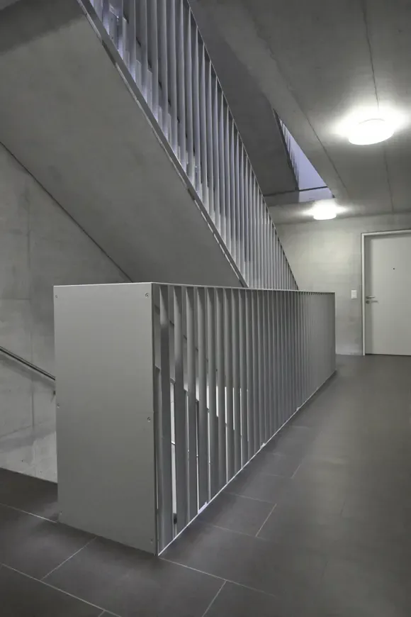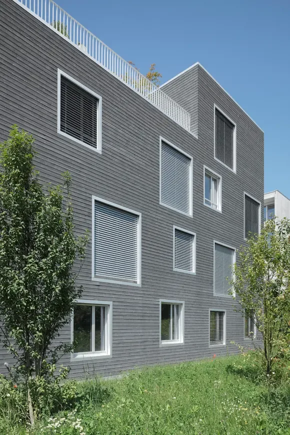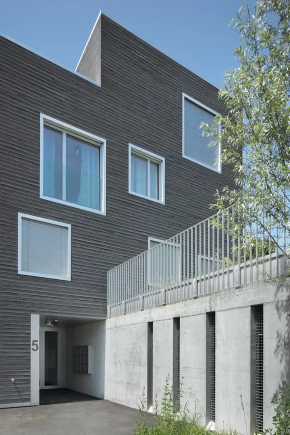 Das fünfte Haus steht auf einer eigenen Parzelle, welche durch einen Gehweg von der restlichen Überbauung abgekoppelt ist. Die dreieckige Grundstücksgeometrie dieser Parzelle verlangt nach einem anderen Gebäudetyp. Durch zwei zueinander verschobene Gebäudeteile entstehen wertvolle Belichtungs- und Aussenraumqualitäten für alle Wohnungen.