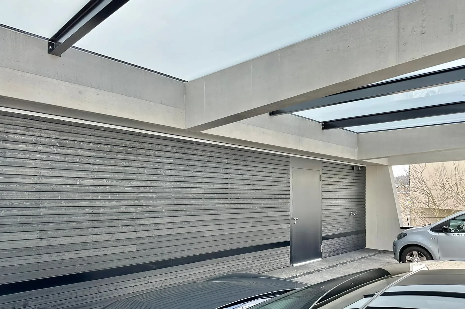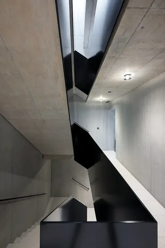 Der Baukörper in Sichtbeton wird stark durch die geneigten Terrassenbrüstungen im Süden und durch die Faltung der Ost- und Westfassade geprägt. Mit einer trichterartigen Bewegung öffnet sich der Bau einerseits gegen den Nellweg und andererseits gegen das Dorf und die Aussicht.