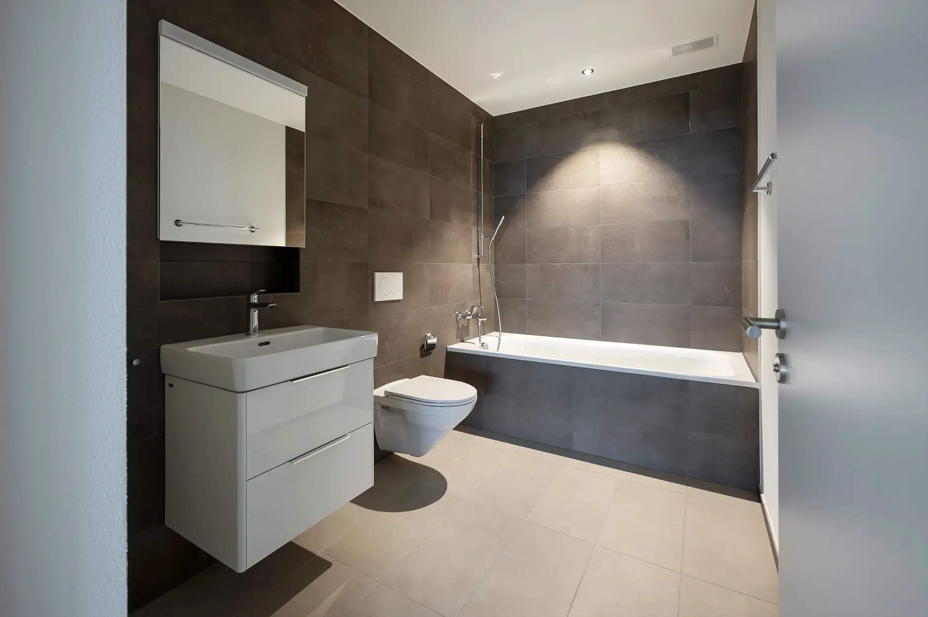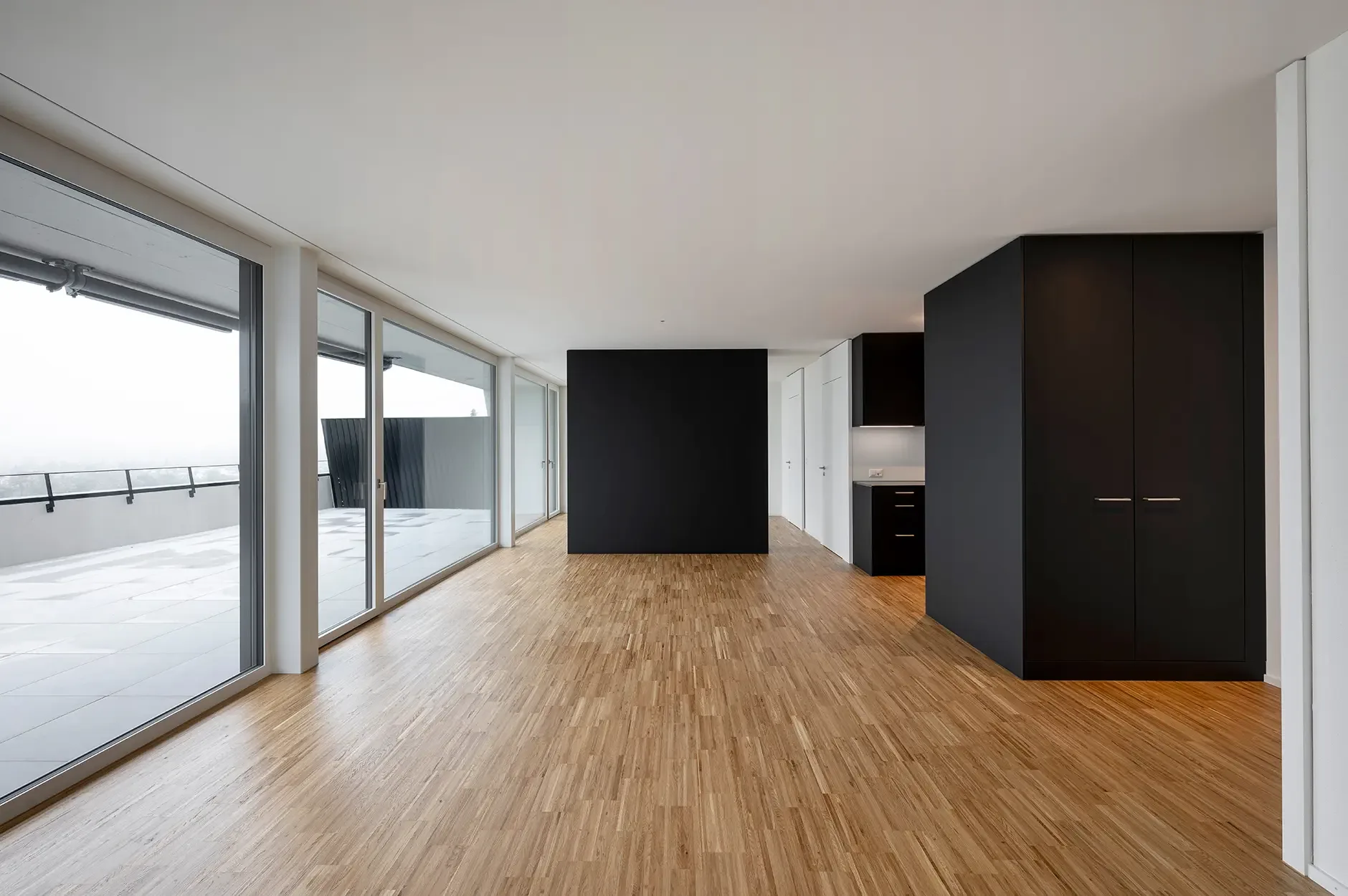 Die Technik- und Kellerräume sind hangseitig hinter dem Treppenhaus im zweitobersten Geschoss angeordnet. Auf dem Dach ist eine PV-Anlage geplant.