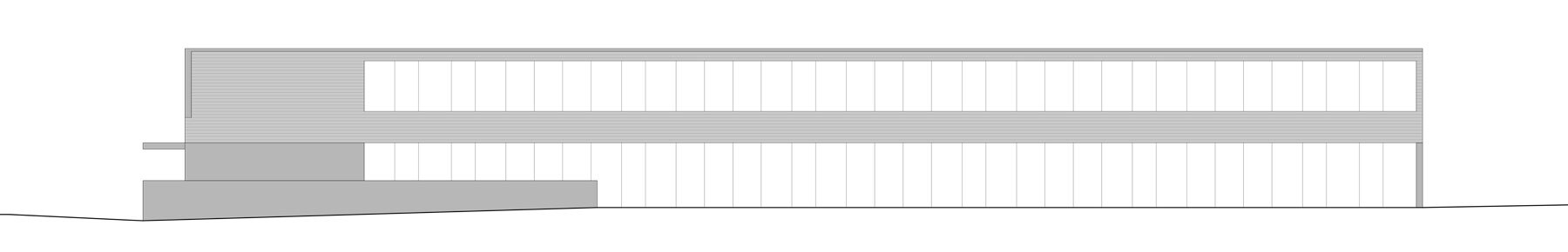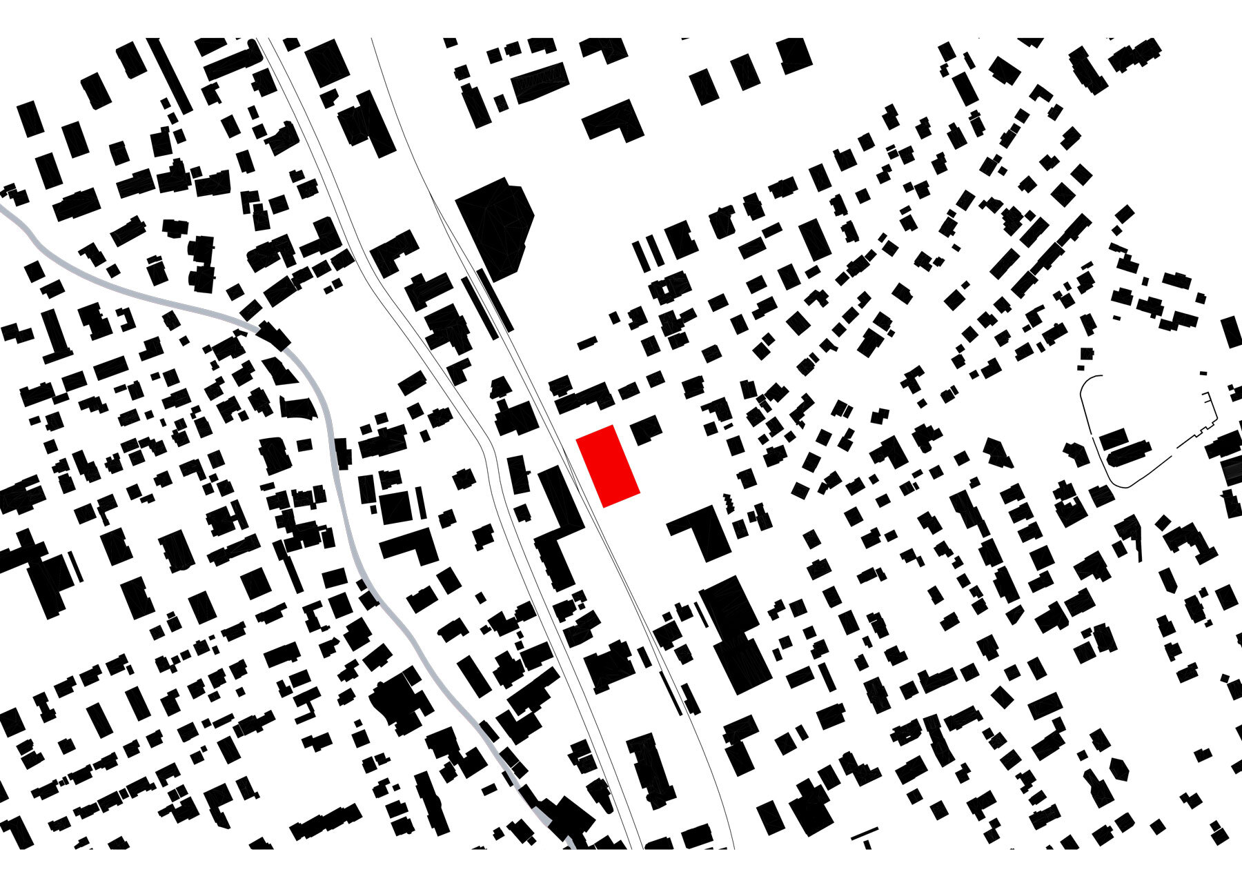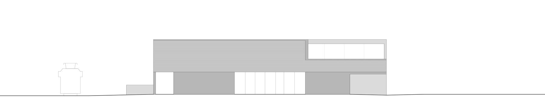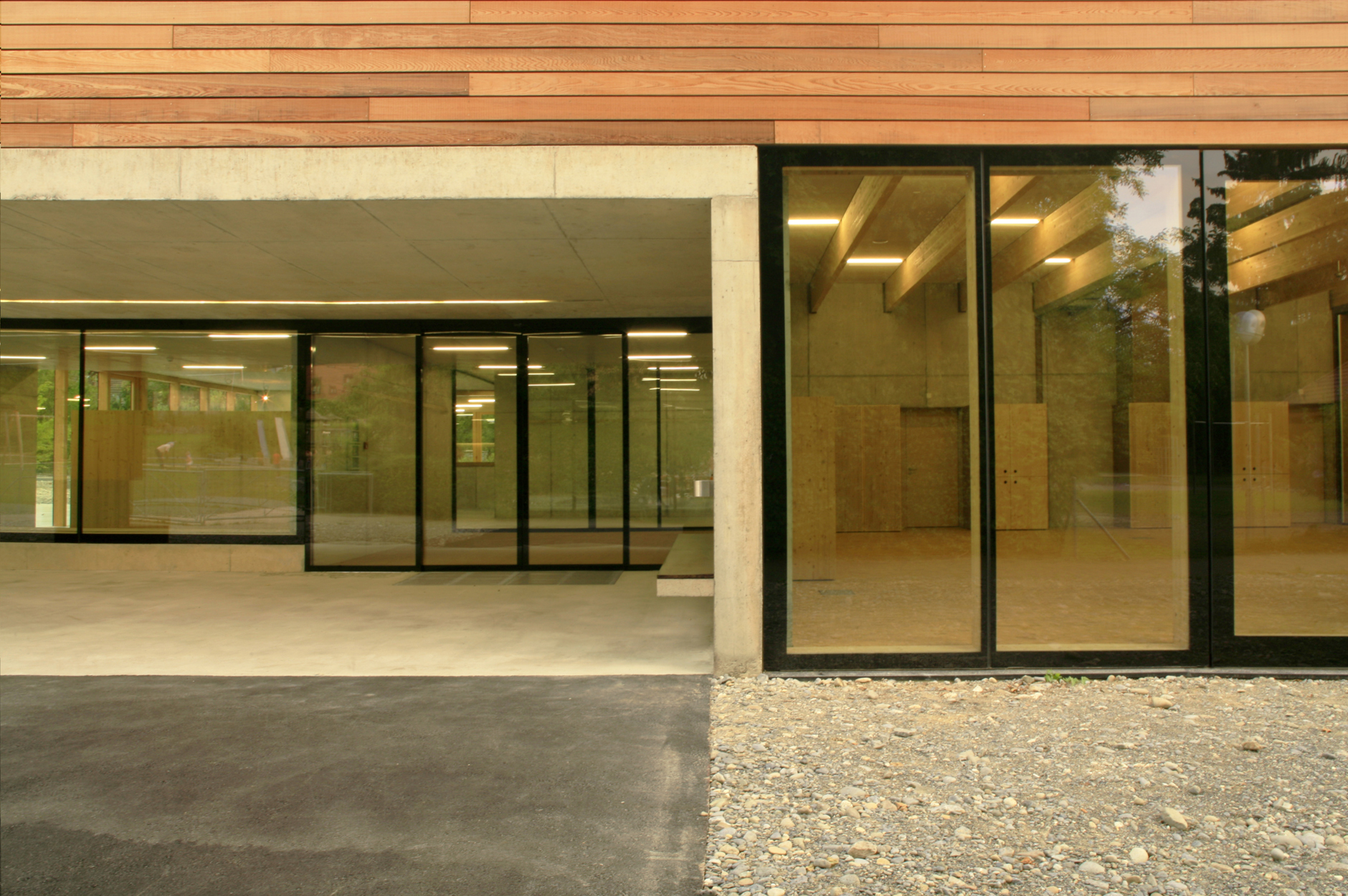 Der Neubau ist als kompakter Baukörper an die Nordgrenze der zur Verfügung stehenden Parzelle gestellt. Gegenüber dem WSB-Trassee und der Baselgasse ist der Bau 2‑geschossig, nach Osten 1‑geschossig konzipiert.