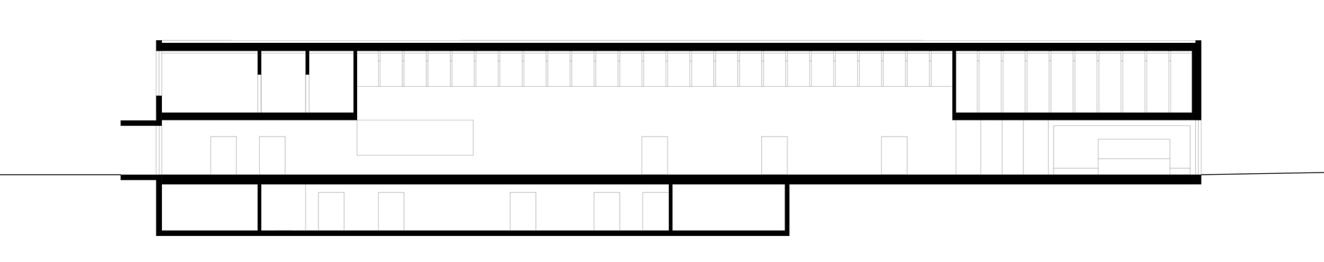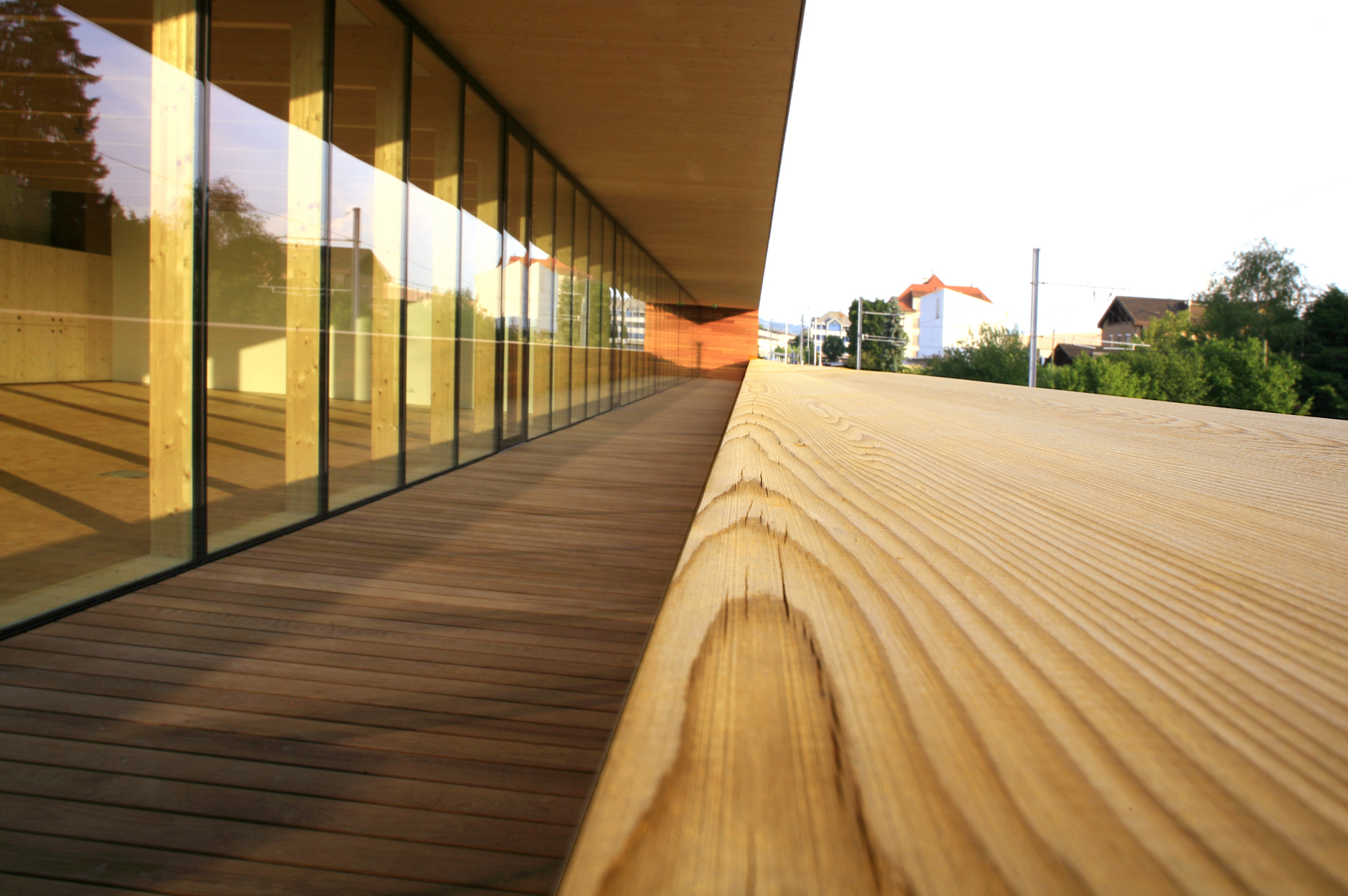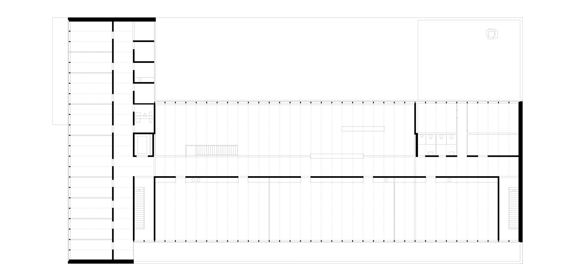 Der Neubau ist als kompakter Baukörper an die Nordgrenze der zur Verfügung stehenden Parzelle gestellt. Gegenüber dem WSB-Trassee und der Baselgasse ist der Bau 2‑geschossig, nach Osten 1‑geschossig konzipiert.