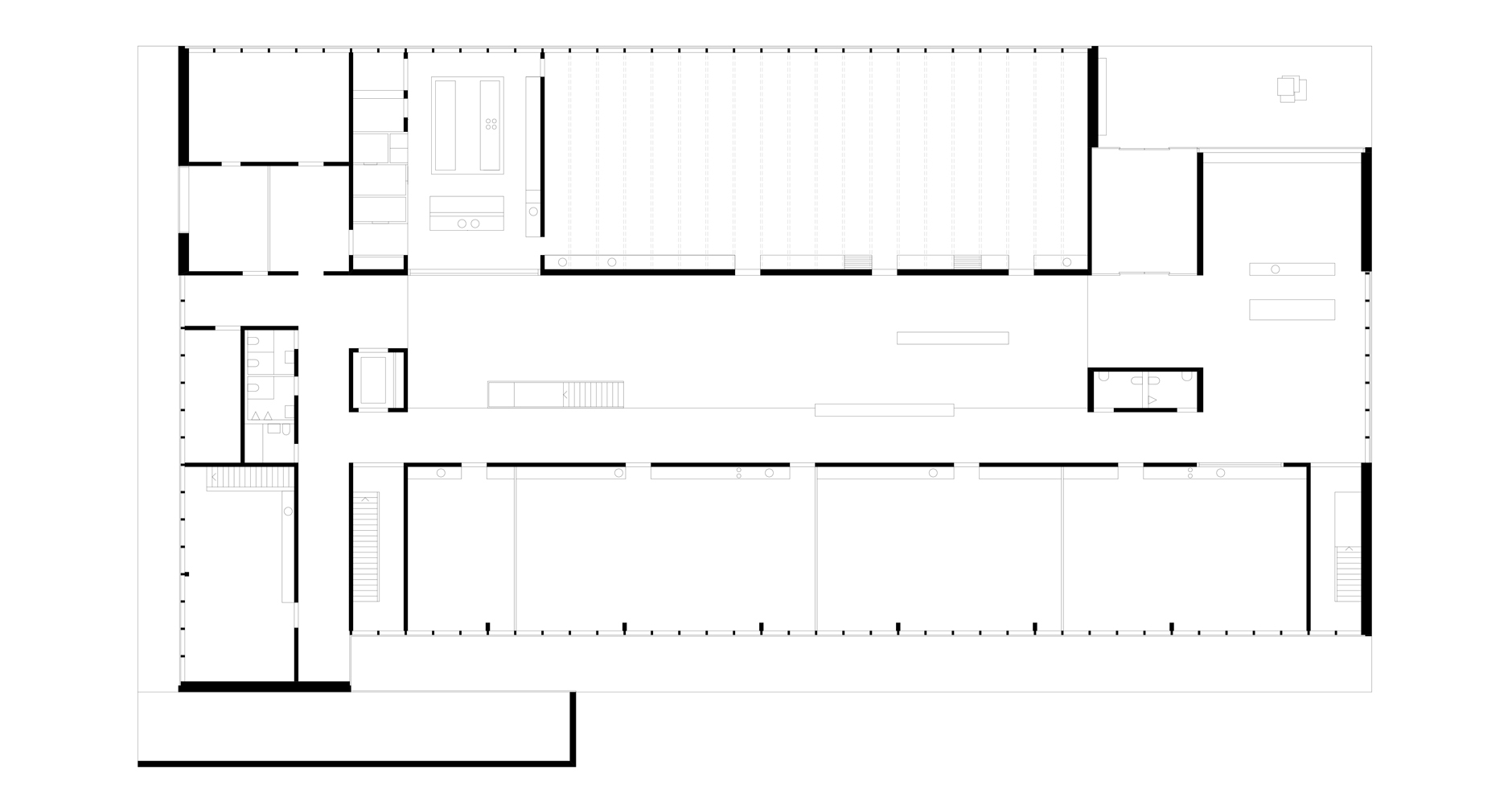 In das Gebäude, ein einfaches, kompaktes Rechteck, sind verschiedene weitere Rechtecke eingeschoben, in denen die einzelnen Nutzungsgruppen angeordnet sind. Innerhalb dieser Nutzungsgruppen ist eine maximale Flexibilität gewährleistet. So können im Werkstatttrakt, im Bürobereich und im Trakt Mehrzweckraum/Essen/Kochen sämtliche Leichtbauwände verschoben oder ganz entfernt werden.