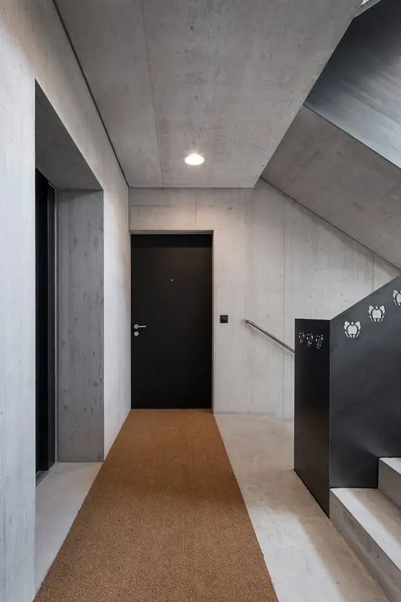 Das Gebäude ist als Zweispänner konzipiert mit einem mittigen Treppenhaus und je einer loftartigen Wohnung zu beiden Seiten. Die Küchen liegen dabei in der Schicht des Treppenhauses und das Bad ist in den «Einraum» so eingeschrieben, dass sich strassenseitig der Wohnraum, hofseitig der Schlafbereich und dazwischen der Essbereich befinden. Im Attikageschoss gibt es zwei Maisonette-Wohnungen mit Dachterrasse.