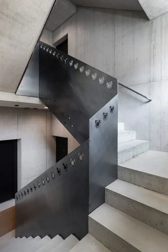 Die Materialisierung im Inneren besteht aus Betonwänden und -decken, weiss gestrichenem Backstein, Hartbetonböden und schwarz gestrichenen Einbauten für Küche und Bad. Das Treppengeländer aus rohbelassenen Stahlplatten wurde mit einem stilisierten Engel vielfach perforiert. Als Vorlage diente eine bedruckte Tapete im Treppenhaus des Vorgängerbaus.